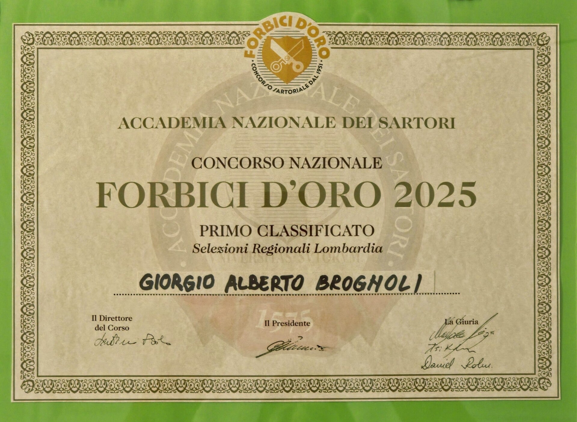 Sono Giorgio Alberto Brognoli, classe 1998, nato a Brescia. La mia vocazione per la sartoria è nata a soli 14 anni, quando ho deciso di dedicare i miei studi a quest'arte. Ho coltivato la mia passione attraverso diverse esperienze lavorative, ognuna delle quali mi ha avvicinato sempre più al cuore del mestiere. Nel 2021 ho realizzato il mio sogno aprendo la mia sartoria.